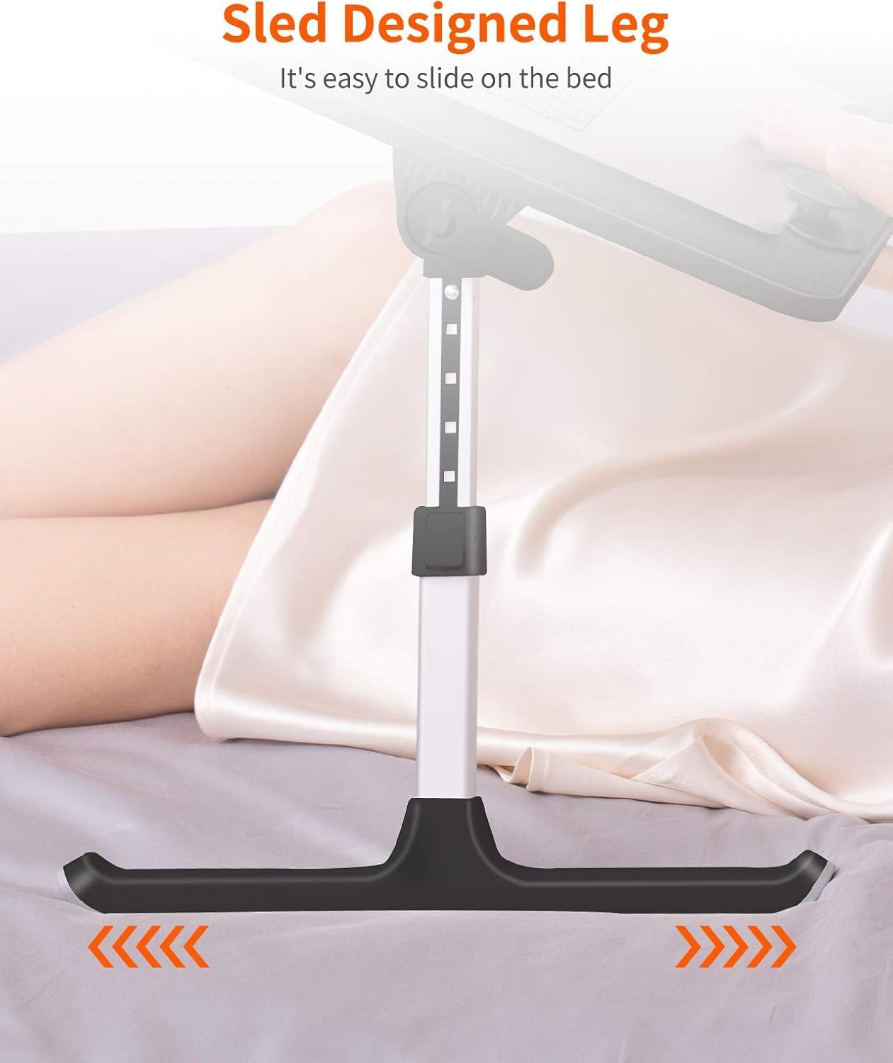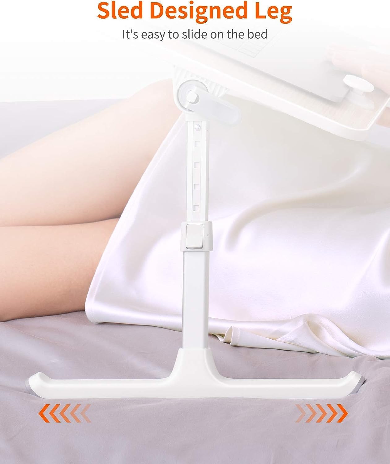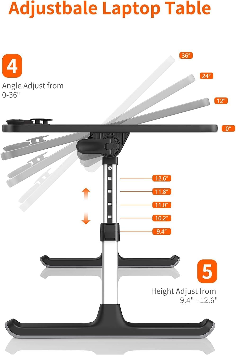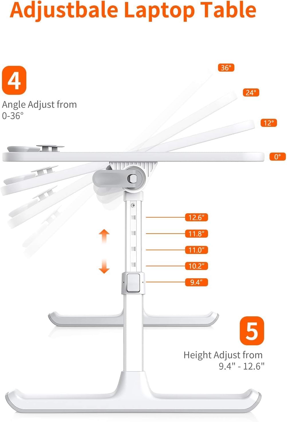 - Ergonomic Design Bed Desk - Soft wrist rest pad provides your wrist a comfortable place. The retractable blocker protects your computer from falling down. 5 adjustable heights(9.4"-12.6") and 4 adjustable angles (0-36°) provide you a more comfortable posture and avoid back & neck pain.