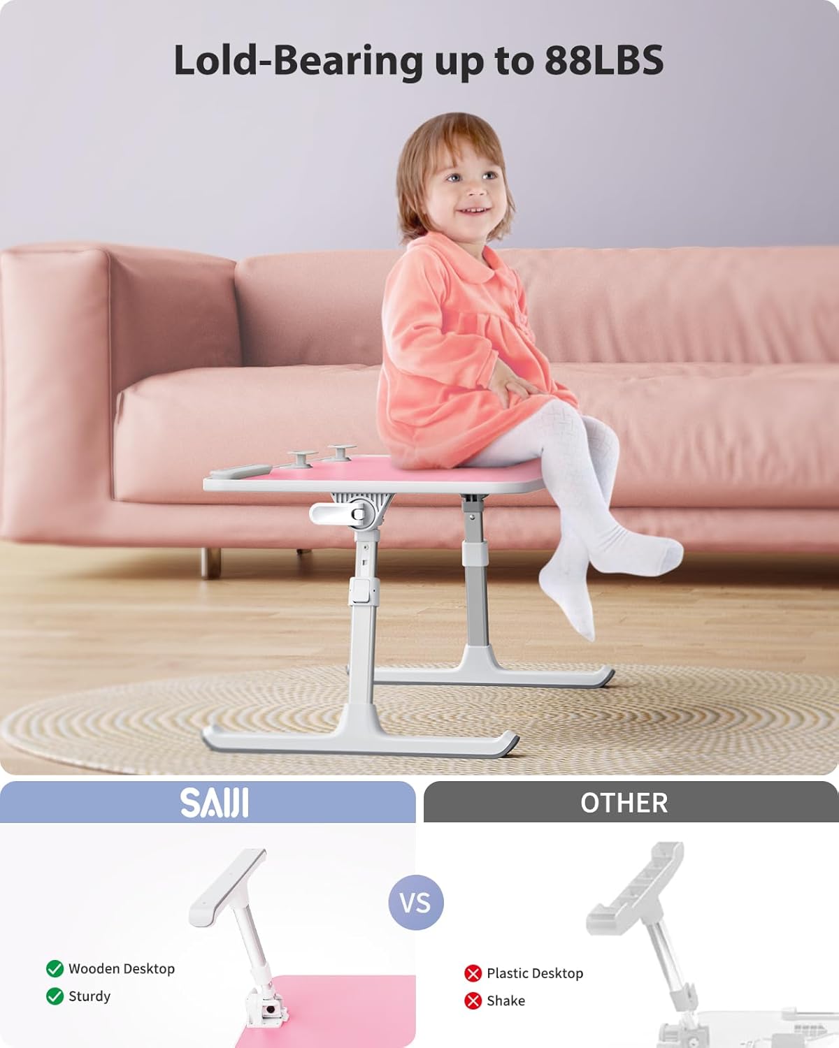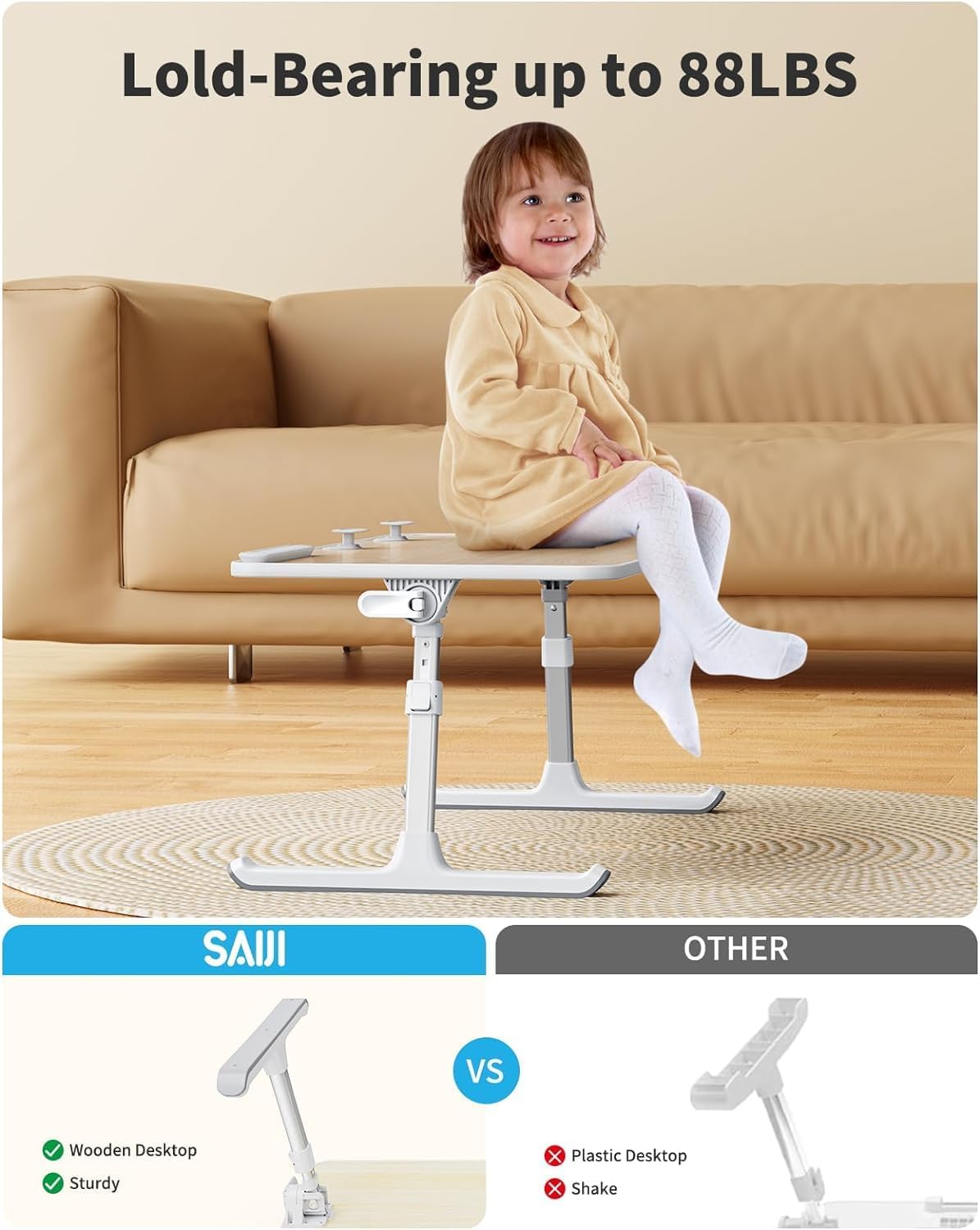 - Stable and Sturdy Laptop Bed Desk: The SAIJI laptop table panel is made of durable wood, which is long lifespan and not easy to break. The table legs are made of high-quality metal which can hold up to 80 pounds of weight. It won’t collapse and break.